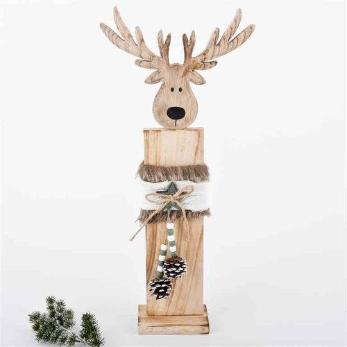Oggetto di design per il tuo Natale. Si abbina ad un locale rustico con arredamento shabby. E' completamente realizzata in compensato, levigato e verniciato. Alla cima del legno si trova la stilizzazione della testa di una simpatica renna, anch'essa in legno. E' presente un fiocco di corda con due pigne, che danno l'idea di essere gli zoccoli della renna stessa. Dimensioni: altezza centimetri 50. Base centimetri 7x11.