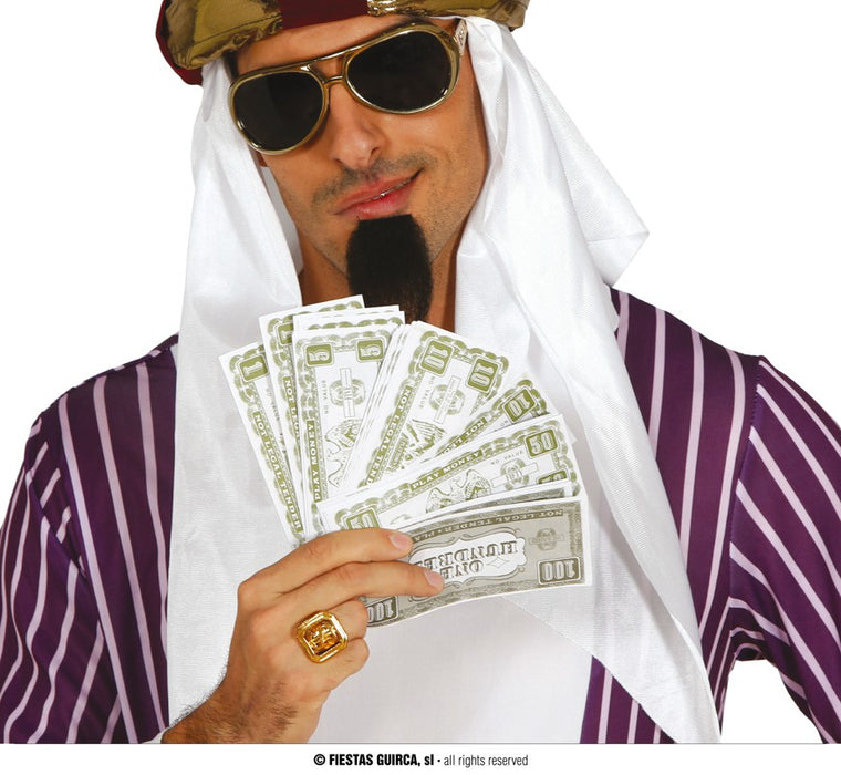 Busta contenente 75 banconote americane (dollari finti) stampati in diversi tagli: 1 dollaro, 5, 10, 50 e 100 $. Le banconote sono bifacciali. In ogni lato c'è scritto che si tratta di una banconota falsa. Perfetto accessorio per vestire i panni di uno sceicco o di un americano molto possidente.