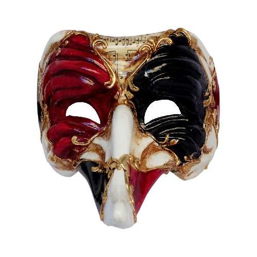 Maschera Veneziana Zanni dal naso pronunciato, coloratissima in rosso, oro, bianco e nero, finemente rifinita e impreziosita da note musicali riprodotte nella parte alta della maschera. L'espressione astuta e furba completa il quadro di questa magnifica maschera del Carnevale di Venezia.
