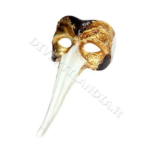 Elegante Maschera Veneziana Zanni a scacchi color oro e cuoio, rifiniti con intarziature in stucco veneziano dorate. A completare la bellezza di questa maschera totalmente Made in Italy, il lungo naso tipico delle maschere Zanni, totalmente bianco.