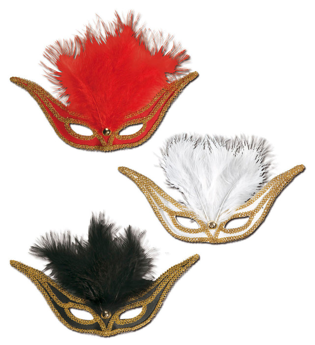 Maschera modello domino rondine con l'aggiunta di eleganti piume sulla estremita' superiore dell'articolo. I colori disponibili sono il bianco e il rosso. Impreziosisci qualsiasi look con la sofisticata raffinatezza di questa maschera. Dalle tue notti in maschera ai capodanni, farai colpo con eleganza.