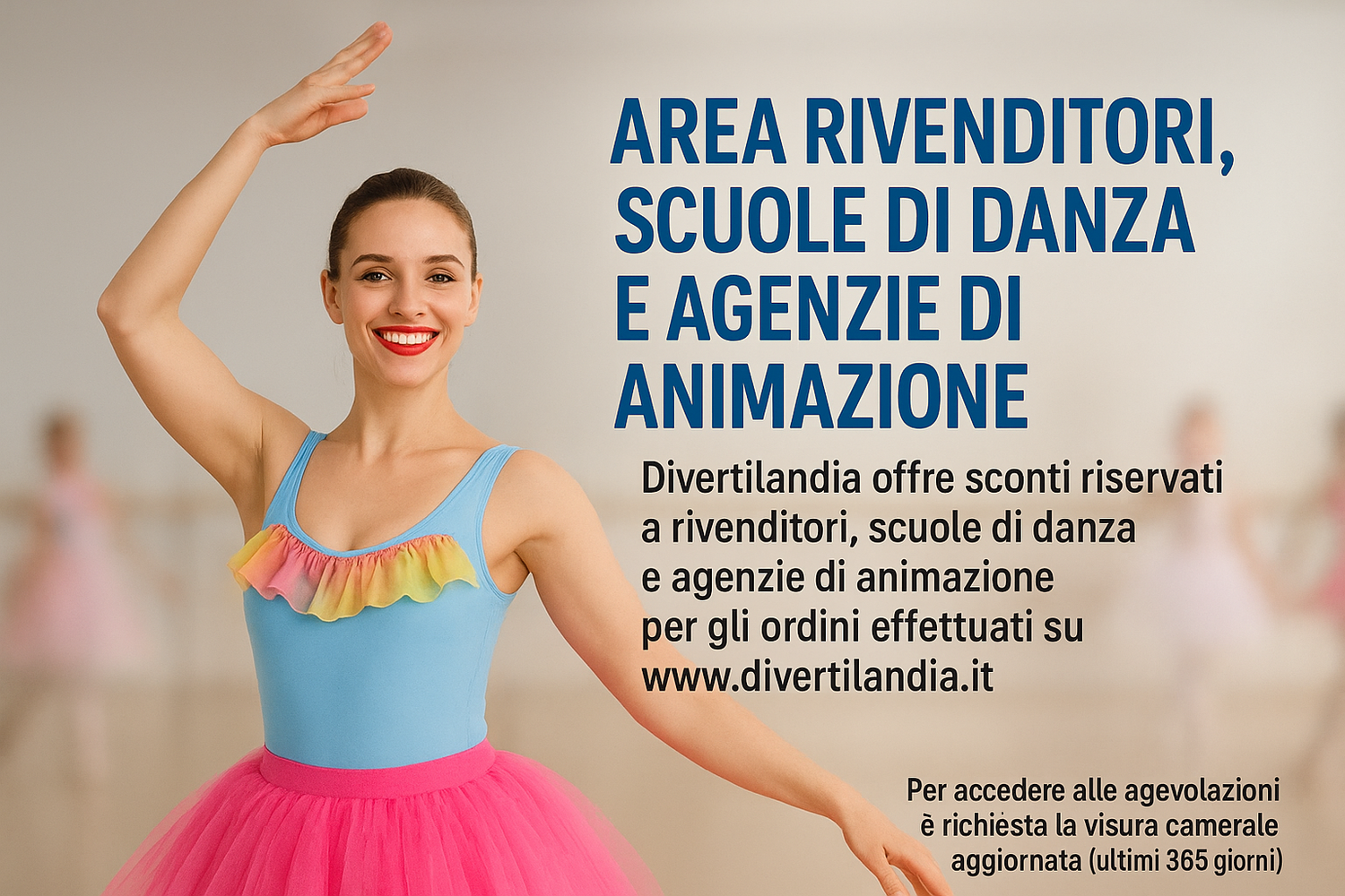 Divertilandia offre sconti riservati a rivenditori, scuole di danza e agenzie di animazione per gli ordini effettuati su www.divertilandia.it