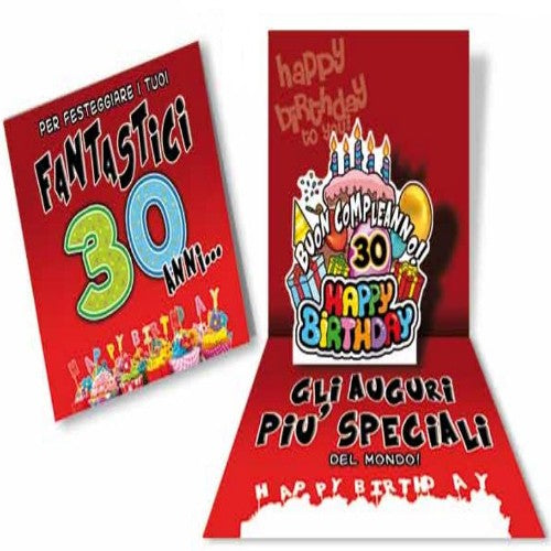 Un biglietto di auguri per i 30 anni. Dimensioni: centimetri 17 x 13. Realizzato i ncartoncino colorato e resistente.