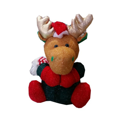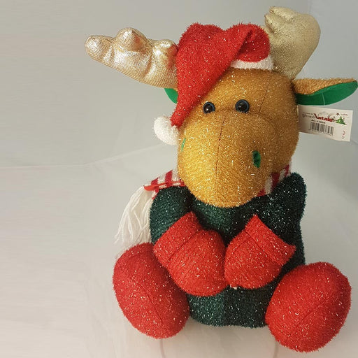Sofficissimo peluche che riproduce una renna con in testa un cappuccio di Babbo Natale e sciarpa bianco e rossa. Altezza centimetri 30.