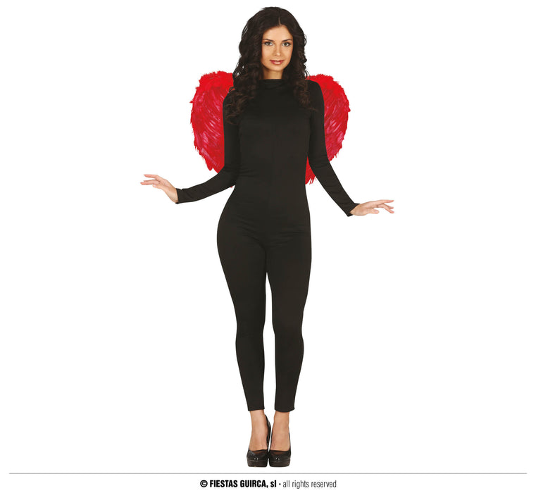 Ali da angelo/diavolo di colore rosse, realizzate con una base di cartone e piume. Si indossano grazie alle pratiche bretelle elasticizzate, poste nella parte interna dell'articolo. Hanno una forma molto particolare. Le dimensioni sono: cm 50 x cm 40.