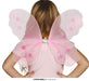 Ali da farfalla per bambina di colore rosa con glitter fuxia. Si indossano comodamente grazie alle pratiche bretelle tipo zaino, all'interno dell'articolo. Tra l'ala di destra e quella di sinistra è presente la stilizzazione di una farfalla di colore fuxia. Le ali sono adatte a bambine fino ai 5 anni di età. La struttura delle ali è metallica ed è ricoperta di tulle. Dimensioni ali cm 40 X cm 30.