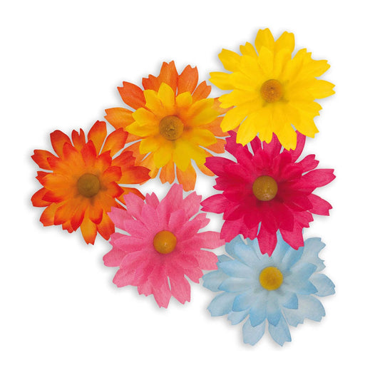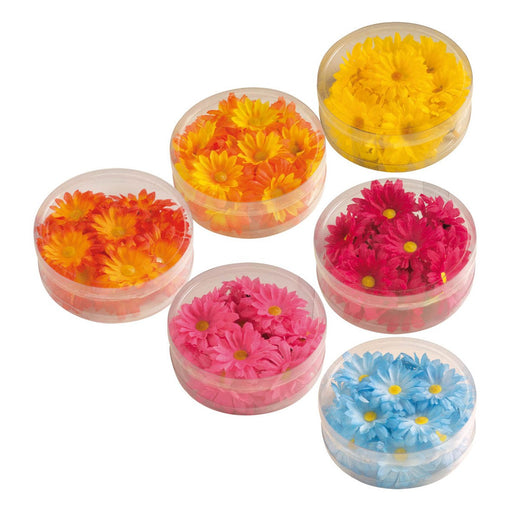 Scatola contenente 20 fiori dello stesso colore dal diametro di circa 5 cm; si tratta di margherite colorate in giallo, arancione, celeste, fuxia, ...