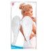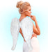 Ali modello angelo realizzati con una base di cartoncino ricoperta di piume di colore bianco. Si indossano con estrema facilità, grazie alle pratiche bretelle elasticizzate poste all'interno delle ali stesse. L'imbracatura in questo modo è tipo zaino. Le dimensioni di questa tipologia di ali è lunghezza centimetri 67 x una larghezza di centimetri 64. Si tratta di un buon paio di ali carnevalesche, ad un prezzo accessibile