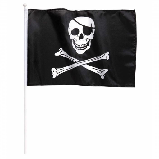 BANDIERA PIRATI IN TESSUTO NERO CON STECCA DI PLASTICA PER SUPPORTO. DIM. LUNGH.30 CM x LARGH. 40 CM