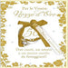 Biglietto d'auguri per le nozze d'oro. Il biglietto è classico con decorazioni a rilievo. Si trova scritto: due cuori, un amore e un mezzo secolo da festeggiare!