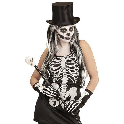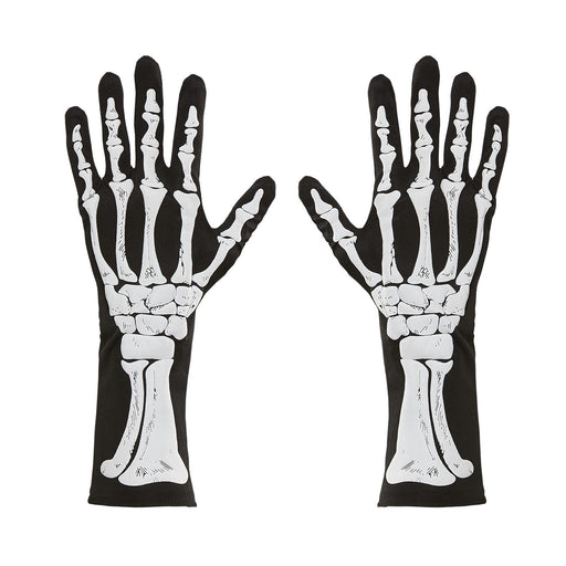 Guanti in tessuto di poliestere con impresse le ossa da scheletro. La lunghezza è di centimetri 35 circa.