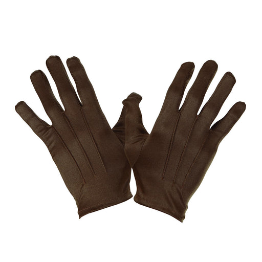 Guanti in poliestere di buona fattura con cuciture, di colore marrone in misura unica. Dimensioni in centimetri: lunghezza 23 e larghezza 9. Da abb...