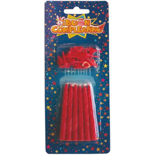 Confezione contenente 12 candeline in cera con supporto in plastica colorate di rosso. Altezza centimetri 6, metteranno allegria alla tua festa.