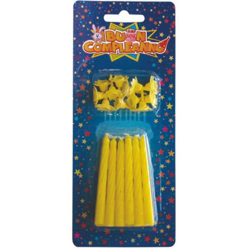 Confezione contenente 12 candeline in cera con supporto in plastica colorate di giallo. Altezza centimetri 6, metteranno allegria alla tua festa.