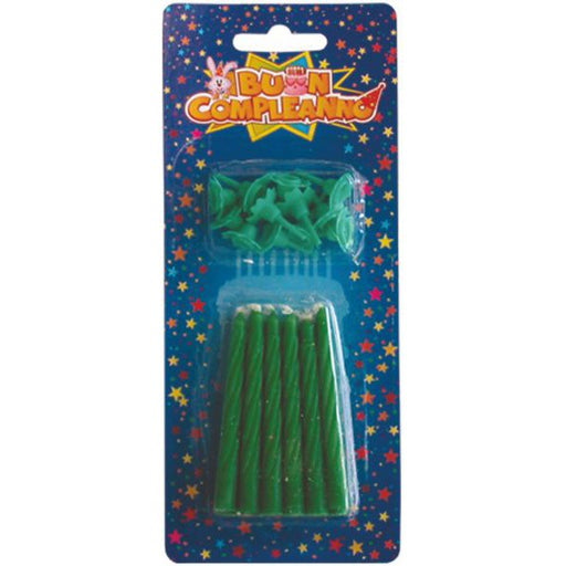 Confezione contenente 12 candeline in cera con supporto in plastica colorate di verde. Altezza centimetri 6, metteranno allegria alla tua festa.