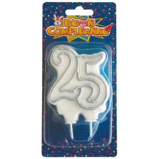 Candela in cera a forma di numero 25 con glitter argentati. La candela può essere utilizzata per festeggiare i 25 anni di matrimonio. Dimensioni: c...