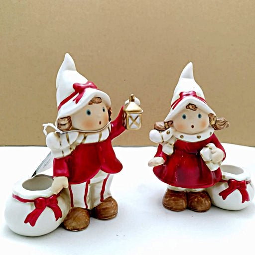 Statuetta in ceramica decorative natalizia raffigurante una coppia di simpatici folletti, gli aiutanti di Babbo natale, che tengono in mano un supp...