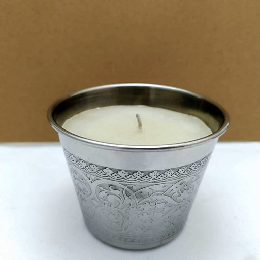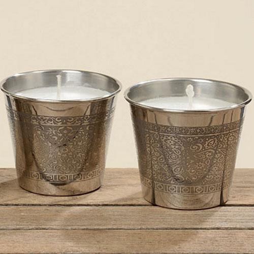 Vasetto in metallo martellato e ricercato. All'interno è presente una candela di generose dimensioni: Dimensioni: altezza centimetri 9, diametro ce...