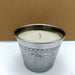 Vasetto in metallo martellato e ricercato. All'interno è presente una candela di generose dimensioni: Dimensioni: altezza centimetri 9, diametro centimetri 10.