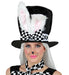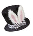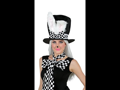 Cilindro molto simpatico, che rimanda alla mente un famoso coniglio sempre pressato dalla fretta e con un orologio al collo. Il cilindro è realizzato in tessuto. Sono presente delle orecchie da coniglio, sulla parte frontale. Sempre sul davanti è presente una fascia, con fiocco. La striscia di tessuto è di colore bianco e nero.