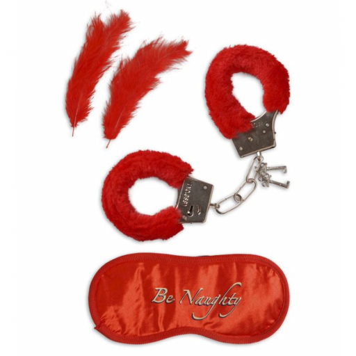 SET COMPOSTO DA ; MANETTE DELL'AMORE IN PELOUCHE, MASCHERINA PER OCCHI IN TESSUTO ROSSO E DUE PIUME ROSSE.