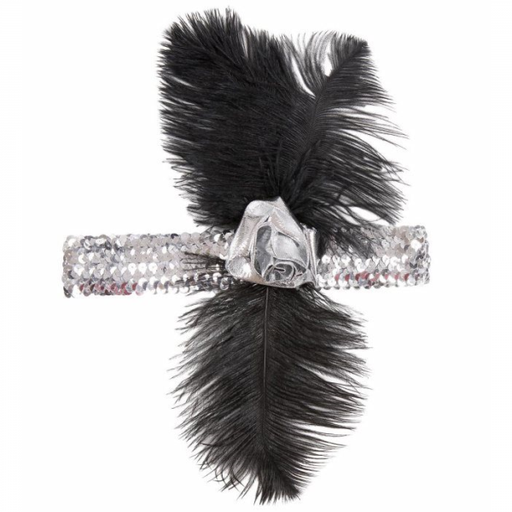 FASCIA PER TESTA IN PAILETTES ARGENTO CON PIUMA NERA. OTTIMO ACCESSORIO PER COMPLETARE IL TUO VESTITO DI CARNEVALE CHARLESTON O CAN CAN.