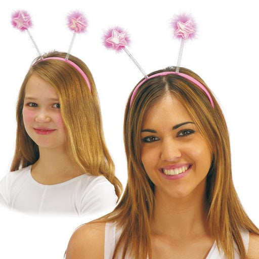 Cerchietto in plastica rosa con antenne a forma di cuore o di stella. Altezza 22 centimetri per 15 centimetri di larghezza.
