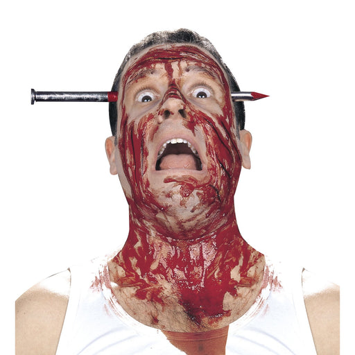 Uno dei più famosi trucchi cinematografici horror utilizzati. Il coltellaccio ficcato sulla testa. Il coltello di plastica è montato sulle due part...