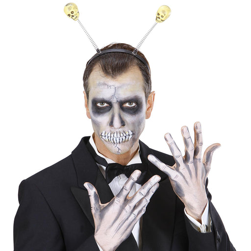 Cerchietto con teschi in cima alle due antenne; splendido e originalissimo gadget per la festa di Halloween.