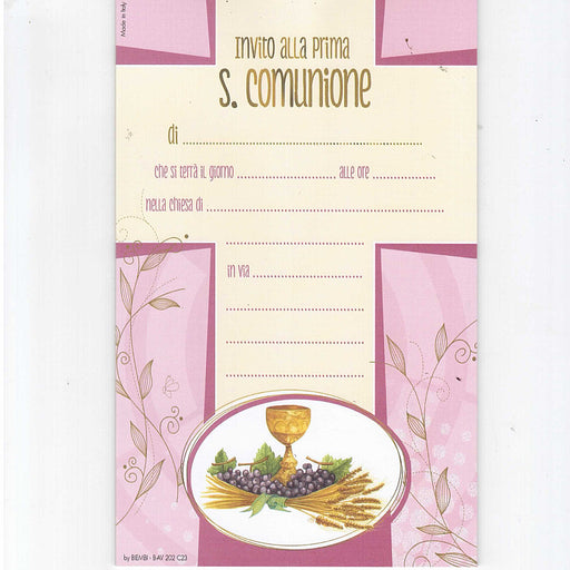Nuovo modello d'invito per la comunione di una bambina. La confezione conta di 20 inviti con relative buste ed è colorato in rosa con vari simboli ...
