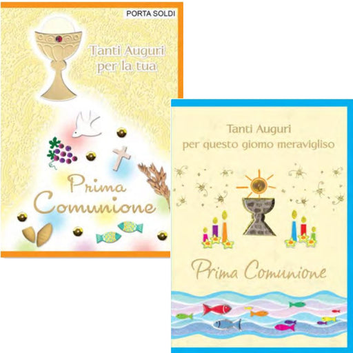 Biglietto per condividere gli auguri per la Prima Comunione di tuo figlio o di un tuo parente o amico. Sono biglietti, dove sul frontespizio sono m...