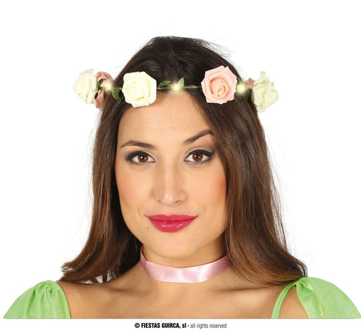 TIARA DI ROSELLINE BIANCHE E ROSA CON LUCI LED MULTICOLOR