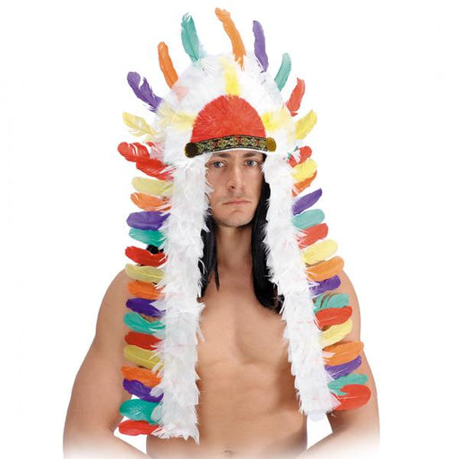 Copricapo indiano con piume di vari colori. Adatto per travestimento da pellerossa. Dimensioni in altezza centimetri 30 e larghezza centimetri 39. ...