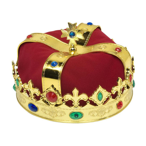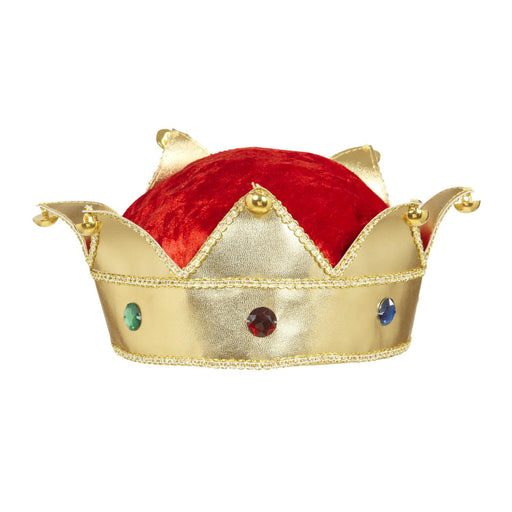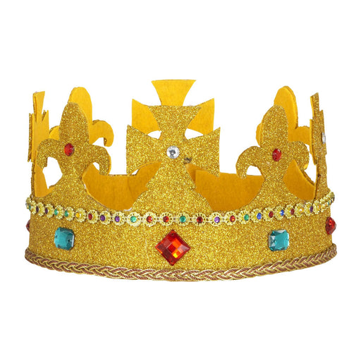 Corona realizzata in tessuto per essere messa sopra la testa e vesire i panni di un vero re. La corona si chiude a cerchio grazie al velcro.