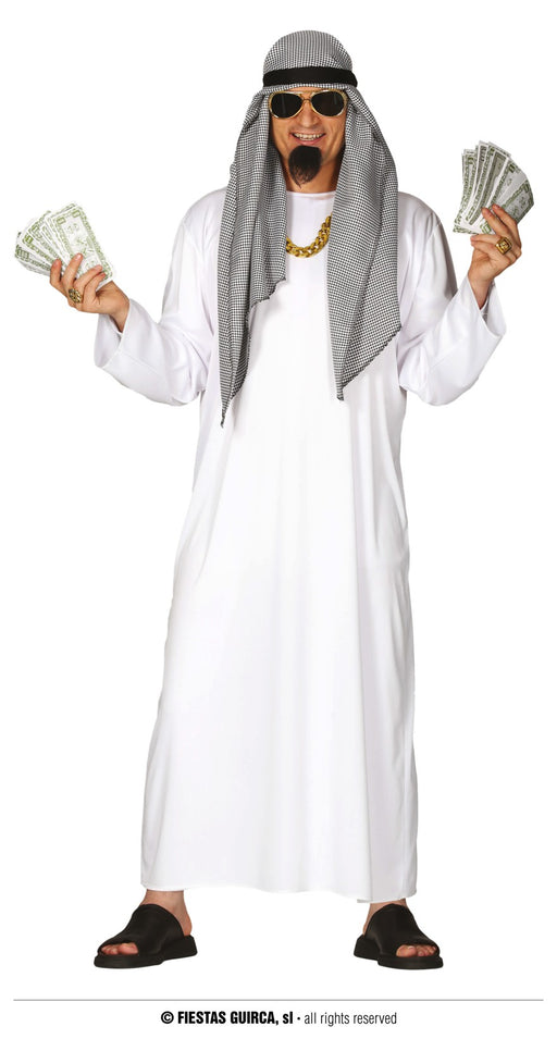 Indossa il costume di Sceicco Arabo L e trasformati in una figura veneranda. Questo costume con la sua tunica di colore bianco e il copricapo, sbal...