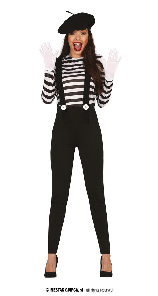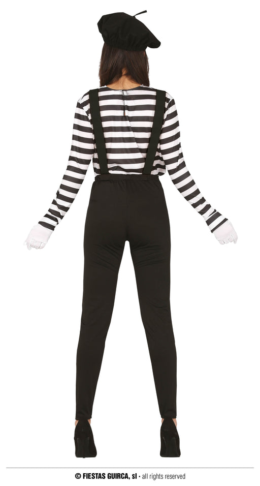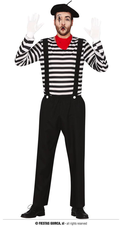 Costume da mimo di strada da uomo. Il costume è comprensivo di: t-shirt, pantaloni, bretelle, baschetto francese e fazzoletto da annodare al collo....