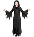 Semplice ma di sicuro effetto questo costumino da Morticia rispecchia l'originale della famiglia Addams, celebre personaggio dell'omonimo film e moglie di Gomez. Il costume in taglia da bambina è realizzato in tessuto di poliestere nero con manica sfrangiata e parte finale dello stesso sfilacciata.