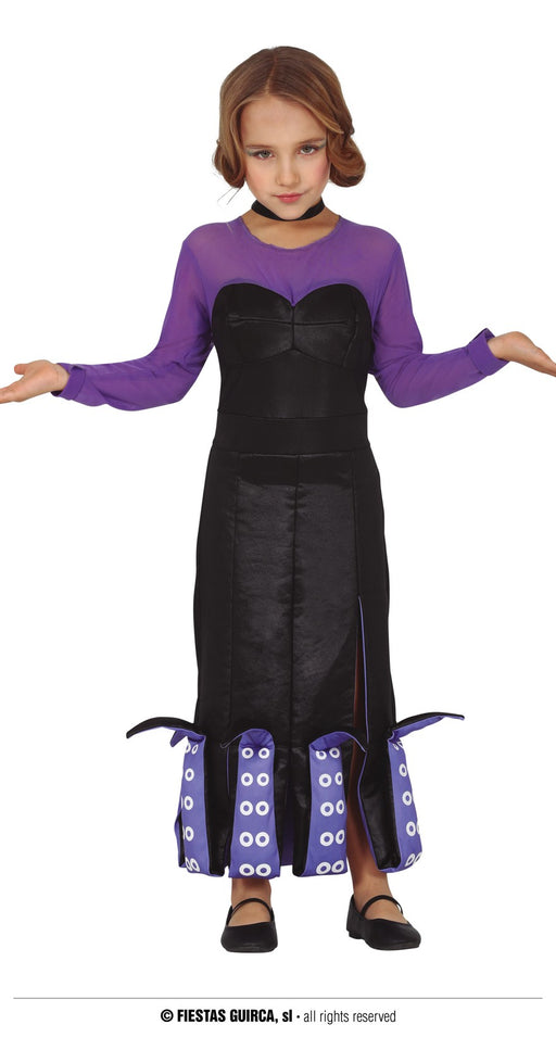 Costume da bimba cattiva del mare. Vestito lungo realizzato in poliestere, con due colori assolutamente contrastanti: viola e nero. L'abito termina...