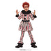 Dal filone horror di IT sono stati realizzati tanti costumi, di ogni colore e per ogni esigenza. Quello che presentiamo ha colori particolari, racchiusi in strisce verticali di colore rosso e nero. Il costume comprende il collare, la parte superiore del vestito, la cintura e i pantaloni. I due pon pon neri sono cuciti sulla parte frontale. Sono disponbili 2 differenti taglie: 5-6 anni e 7-9. Perfetto costume sia per Halloween, sia per Carnevale.