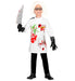 Costume scienziato pazzo da ragazzo composto da camice da laboratorio in poliestere con schizzi di sangue rossi e materiale tossicone verde oltre ai classici attrezzi del mestiere quali forbici, bisturi, siringa, anch'essi stampati; nel travestimento sono inclusi anche i guanti neri. Parrucca non compresa.