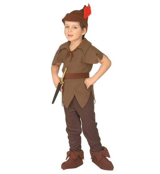 Simpaticissimo costume per bambini da folletto. La confezione comprende: casacca, pantaloni, cintura, copriscarpe e cappello. In tessuto di qualita'.