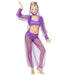 Sensualissimo costume da danzatrice del ventre di colore violetto con bordure colore oro. Nella confezione del costume troverai: top, camicia con gilet, copricapo con velo e pantaloni. Le braccia e le gambe godono dell'effetto trasparente "vedo non vedo". Abbiamo a disposizione tre differenti taglie da donna: la s, la m e la l.