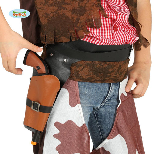 Cinturone da cowboy singolo, con all'interno una pistola. La pistola è di colore nero e realizzata in plastica. Il cinturone è di colore marrone r...