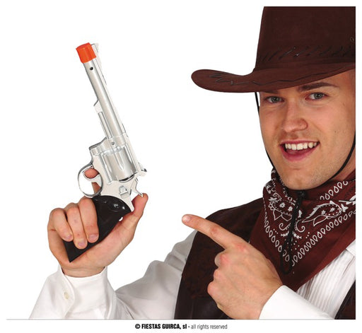 Pistolone da cowboy di colore argento. La pistola è giocattolo e si nota dal tappo di colore arancio, posto sulla parte frontale della canna. La lu...
