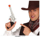 Pistolone da cowboy di colore argento. La pistola è giocattolo e si nota dal tappo di colore arancio, posto sulla parte frontale della canna. La lunghezza della pistola è di cm 32 circa. La pistola è a tamburo. Non si possono utilizzare i colpi, in quanto il tamburo è solamente sagomato e non funzionante. Il grilletto, una volta pigiato, emetterà un suono di "colpo di pistola".
