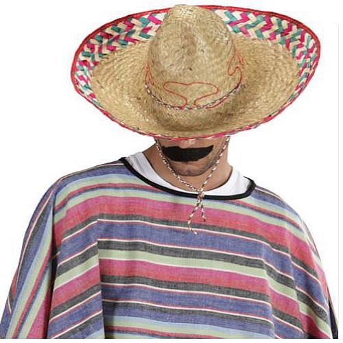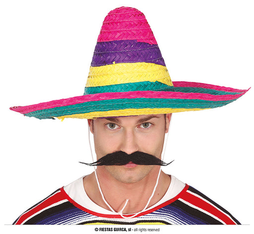 Classico sombrero messicano realizzano in paglia (plastificata) intrecciata. Sulla tesa sono intrecciati dei fili colorati che ravvivano il cappell...