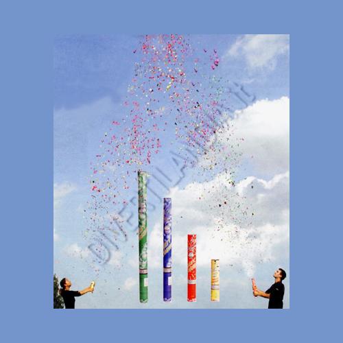 Sparacoriandoli ad aria compressa contenente coriandoli di forma rettangolare di colore blu. Dimensione cannone centimetri 30.