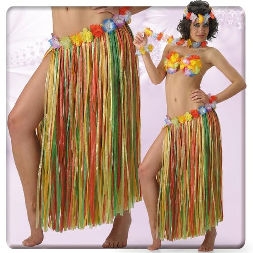 Gonna hawaiana in plastica multicolore. Decorata con fiori di stoffa sui fianchi. Lunghezza 80 centimetri. Ottimo complemento per i costumi in stil...