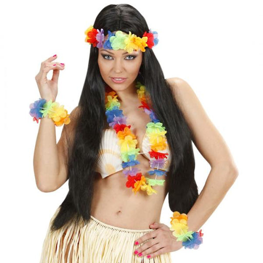 Bellissimo set hawaiiano realizzato completamente in stoffa di qualita'. La confezione comprende una collana, un frontalino e ben 2 braccialetti co...