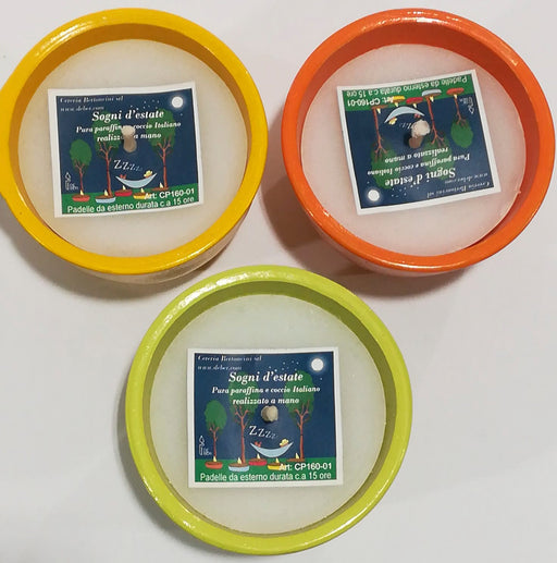 Padella decorativa in coccio colorato, contenente cera bianca, come una candela. Lo puoi tenere acceso durante le tue cene estive all'aperto, con u...